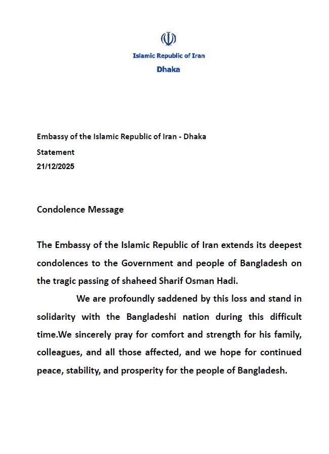 The Embassy of the Islamic Republic of Iran extends its deepest condolences to the Government and people of Bangladesh on the tragic passing of shaheed Sharif Osman Hadi.
