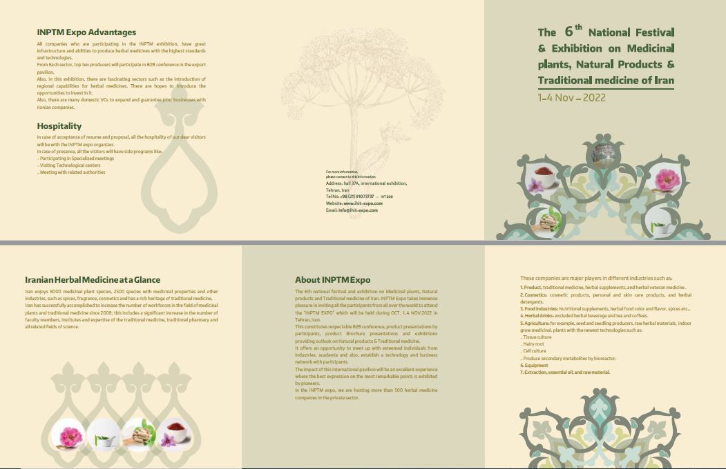 ششمین دور جشنواره و نمایشگاه ملی گیاهان دارویی و فرآوردههای طبیعی و طب سنتی ایران (INPTM) از تاریخ 10 لغایت 13 آبان ماه برابر با 1 لغایت4 نوامبر 2022 در محل دائمی نمایشگاههای بین المللی تهران برگزار خواهد شد.