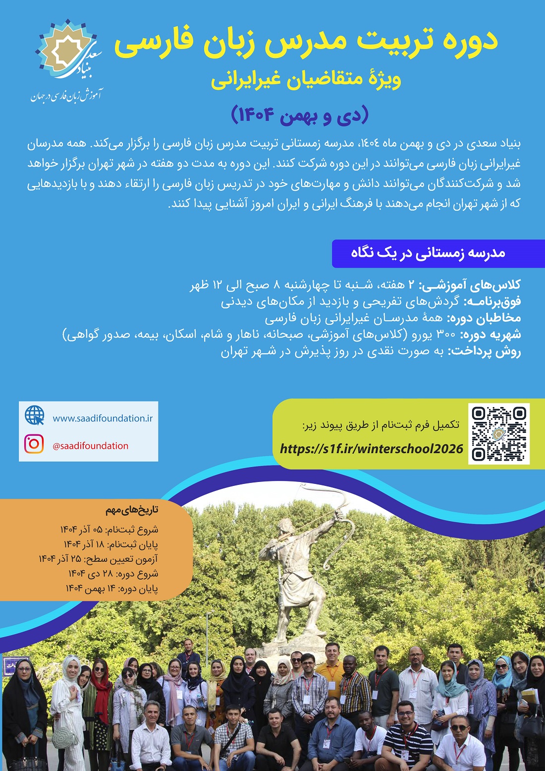 بنیاد سعدی در دی و بهمن ماه 1404 مدرسه زمستانی تربیت مدرس زبان فارسی غیرایرانی را برگزار میکند. همه علاقه مندان به زبان فارسی در سطح پیش میانی و بالاتر میتوانند در این دوره شرکت کنند. این دوره به مدت دو هفته در شهر تهران برگزار خواهد شد و شرکت کنندگان میتوانند در یک محیط واقعی مهارت های زبانی خود را تقویت کنند و با بازدید هایی که از شهر تهران انجام می دهند با فرهنگ ایرانی و ایران امروز آشنایی پیدا کنند.