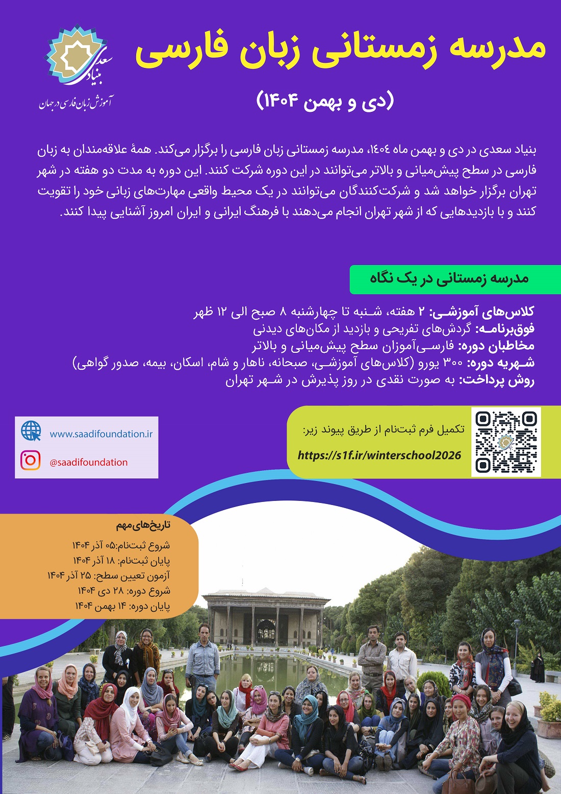 بنیاد سعدی در دی و بهمن ماه 1404 مدرسه زبان فارسی زمستانی را برگزار میکند. همه علاقه مندان به زبان فارسی در سطح پیش میانی و بالاتر میتوانند در این دوره شرکت کنند. این دوره به مدت دو هفته در شهر تهران برگزار خواهد شد و شرکت کنندگان میتوانند در یک محیط واقعی مهارت های زبانی خود را تقویت کنند و با بازدید هایی که از شهر تهران انجام می دهند با فرهنگ ایرانی و ایران امروز آشنایی پیدا کنند.