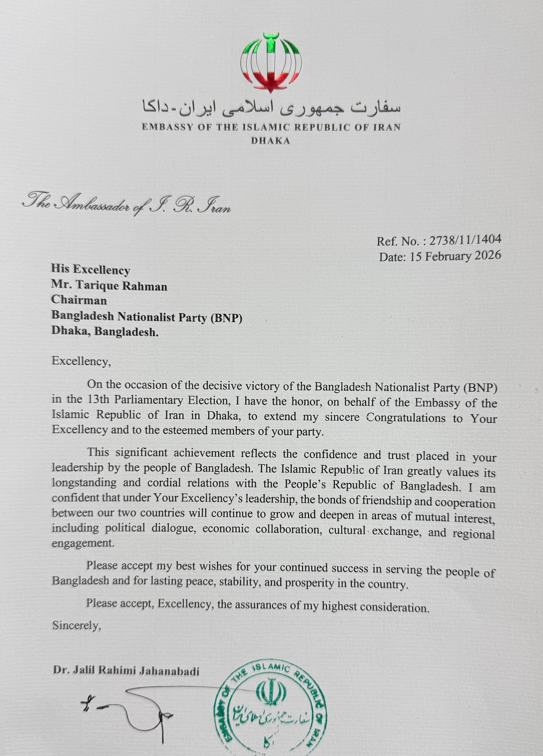 سفیر جمهوری اسلامی ایران در بنگلادش به مناسبت پیروزی حزب ملی گرای بنگلادش برای رهبر این حزب پیام تبریک ارسال کردند