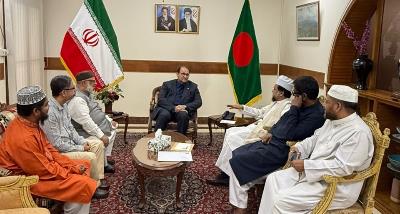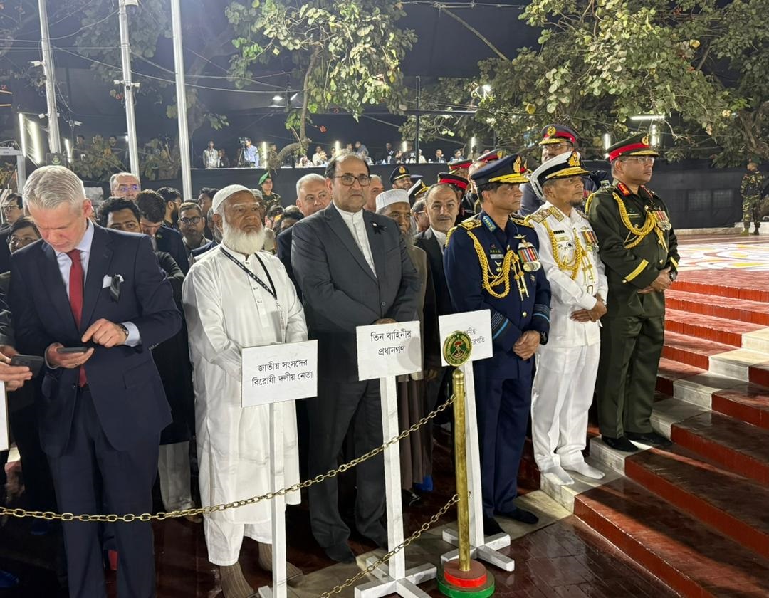 مورخ 21 فوریه (30 بهمن 1404) آقای دکتر رحیمی جهان آبادی سفیر محترم جمهوری اسلامی ایران در بنگلادش در مراسم بزرگداشت مقام شهید و روز زبان مادری که با حضور رئیس جمهور، نخست وزیر و اعضای کابینه، مقامات لشکری و کشوری، برخی نمایندگان پارلمان و دیگر سفرای مقیم در داکا برگزار گردید، شرکت نمودند. این مراسم که در مرکز شهید مینار داکا برگزار شد، از سوی سفیر جمهوری اسلامی ایران و دیگر سفرا دسته گلی را به مقام شهید تقدیم گردید.